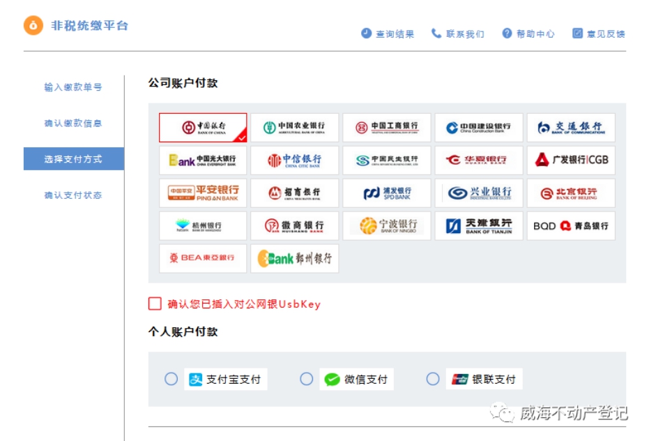 企业或个人如果采用银行网上转账缴费的点击下列链接,输入20位缴款码查询缴费: